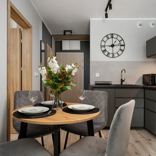 Stół z krzesłami, płyta indukcyjna, lodówka z zamrażarką, piekarnik, zmywarka, ekspres do kawy, czajnik elektryczny, mikrofalówka, naczynia kuchenne i stołowe