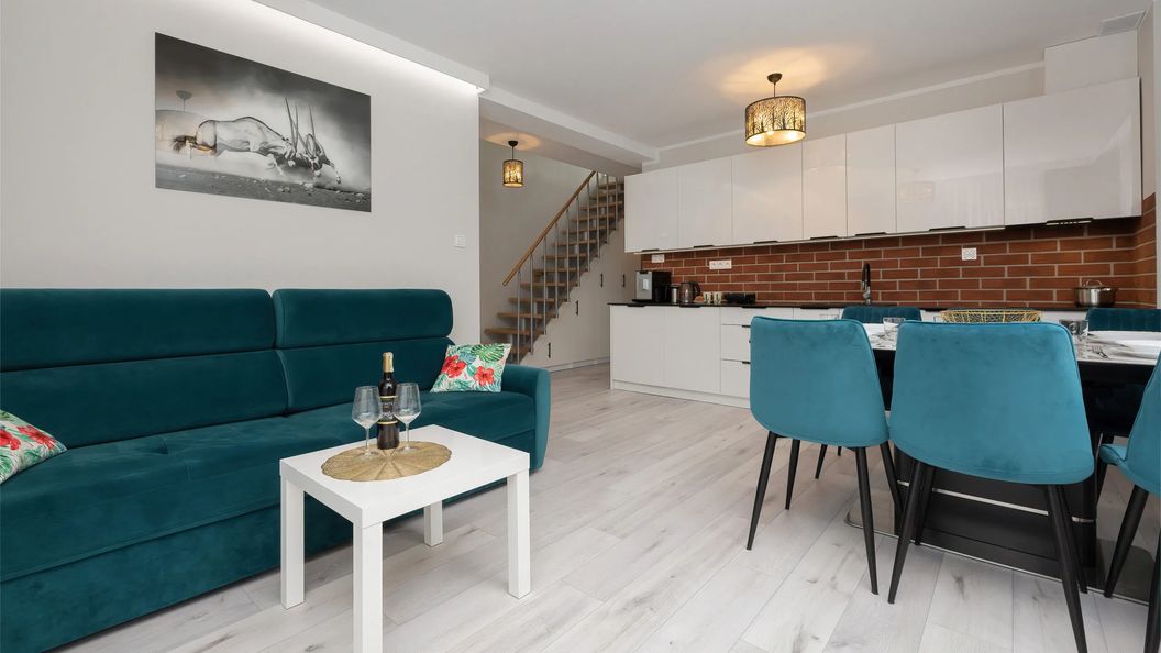 Apartament znajduje się na 2. piętrze i może gościć do 6 osób - to doskonały wybór na grupowe wakacje z rodziną lub przyjaciółmi. Przestronna 64 m² powierzchnia apartamentu jest podzielona na dwa poziomy. Na pierwszym poziomie znajduje się salon z rozkładaną sofą i aneksem kuchennym, sypialnia z podwójnym łóżkiem oraz łazienka z prysznicem. Z salonu jest również wyjście na przytulny balkon z meblami ogrodowymi. Na drugim poziomie znajduje się sypialnia na poddaszu z trzema pojedynczymi łóżkami, druga łazienka z prysznicem oraz duży taras. Taras, wyposażony w stolik kawowy i wygodne fotele, stanowi doskonałe miejsce do spędzania czasu w ciepłe letnie wieczory, z widokiem na zieleń lasu. Wnętrze apartamentu łączy w sobie elegancki, nowoczesny wystrój z wysokim standardem udogodnień. Klimatyzacja w salonie i sypialni na górnym poziomie zapewnia optymalną temperaturę w każdą pogodę i porę roku. Multimedia obejmują telewizor SmartTV z płaskim ekranem oraz bezpłatny dostęp do sieci Wi-Fi. Dodatkowo pełne wyposażenie kuchenne i łazienkowe, takie jak pralka czy zmywarka, zwiększa samodzielność naszych gości. Rodzice podróżujący z dzieckiem mogą również zarezerwować dla swojej pociechy łóżeczko dziecięce i krzesełko do karmienia. Goście podróżujący samochodem mogą zaparkować na prywatnym, zewnętrznym parkingu na terenie osiedla.