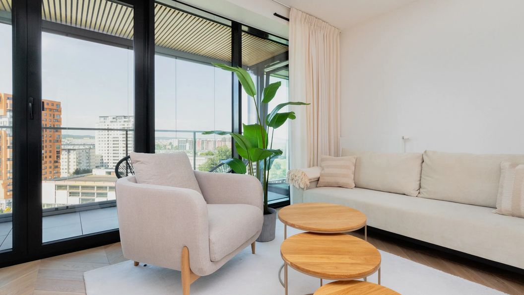 Wnętrze zostało funkcjonalnie zaaranżowane. W części dziennej znajduje się stół jadalniany z krzesłami, a w sypialni wygodne łóżko podwójne i szafa. Z balkonu na 10. piętrze roztacza się widok na panoramę Gdańska, a w oddali można dostrzec morze.