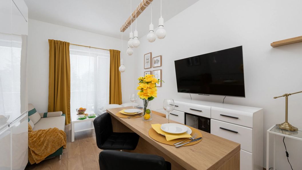 Ten komfortowy apartament typu studio ma możliwość zakwaterowania aż 4 osób. Jest idealnym wyborem zarówno dla osób podróżujących samotnie, w parze, a także dla rodzin czy grup przyjaciół. Przestrzeń apartamentu oferuje część dzienną z aneksem kuchennym, część sypialną z wygodnymi miejscami do spania, balkon oraz łazienkę z prysznicem. Apartament wyróżnia się przytulnym wystrojem, estetyką oraz funkcjonalnością. Część mieszkalna wyposażona w wygodne kanapy, TV i wyjście na balkon stanowi doskonałe miejsce odpoczynku i relaksu. Unikatowe dodatki i drewniane akcenty wprowadzają do wnętrza luksusowy wystrój. Słoneczny balkon z meblami ogrodowymi będzie świetnym miejscem na odpoczynek w ciepłe, letnie wieczory. Dodatkowo, wyposażony w wysokiej jakości sprzęt aneks kuchenny umożliwia przyrządzenie ulubionych posiłków. Ekskluzywny design oraz kompleksowe wyposażenie w niezbędne akcesoria kuchenne oraz łazienkowe gwarantują komfort pobytu.