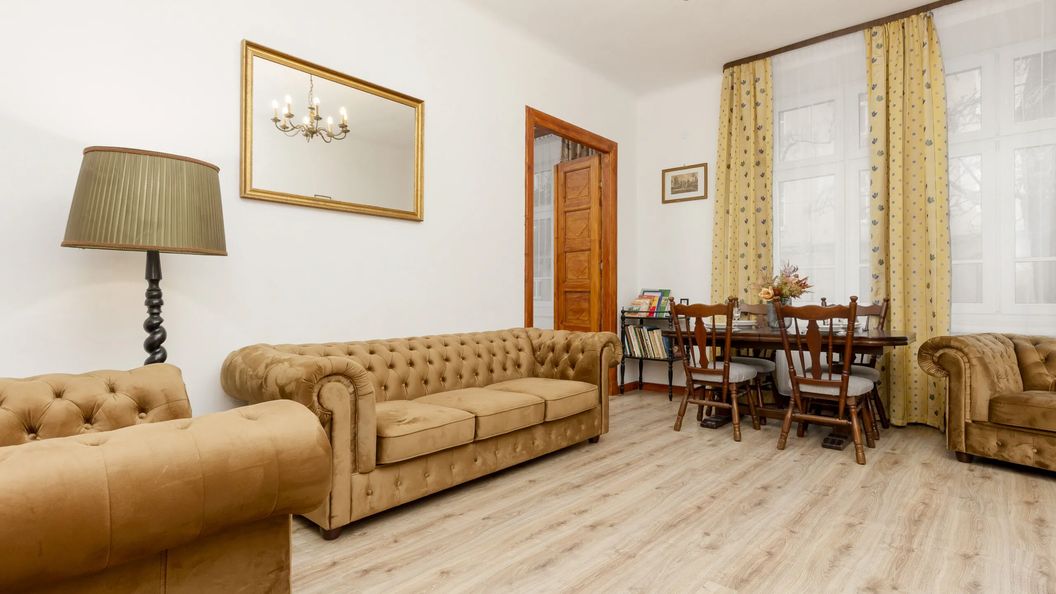 Komfortowe i przytulne mieszkanie (65 m²), które pomieści 7 osób. Składa się ono z salonu z aneksem kuchennym, 2 sypialni i łazienki. Tradycyjny wystrój zapewnia komfort pobytu. Apartament wyposażony jest we wszystkie podstawowe udogodnienia, takie jak żelazko, deska do prasowania, odkurzacz i suszarka do włosów. W przytulnej kuchni dostępna jest mikrofalówka i płyta elektryczna, więc goście mogą samodzielnie przyrządzać posiłki. Apartament wyposażony jest również w szybkie Wi-Fi i telewizor z kablówką. Dla ułatwienia początku pobytu zapewniono bezpłatny zestaw kosmetyków, ręczniki i pościel.