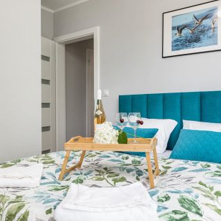 Przestrzeń dzienna obejmuje salon z rozkładaną sofą dla 2 osób i telewizorem, a z pomieszczenia można wyjść na balkon z meblami ogrodowymi. Sypialnia wyposażona jest w podwójne łóżko. W aneksie kuchennym goście znajdą wszystkie niezbędne sprzęty, w tym płytę grzewczą, piekarnik, zmywarkę, lodówkę oraz ekspres do kawy i toster. Wyposażenie łazienki obejmuje pralkę i suszarkę do włosów.