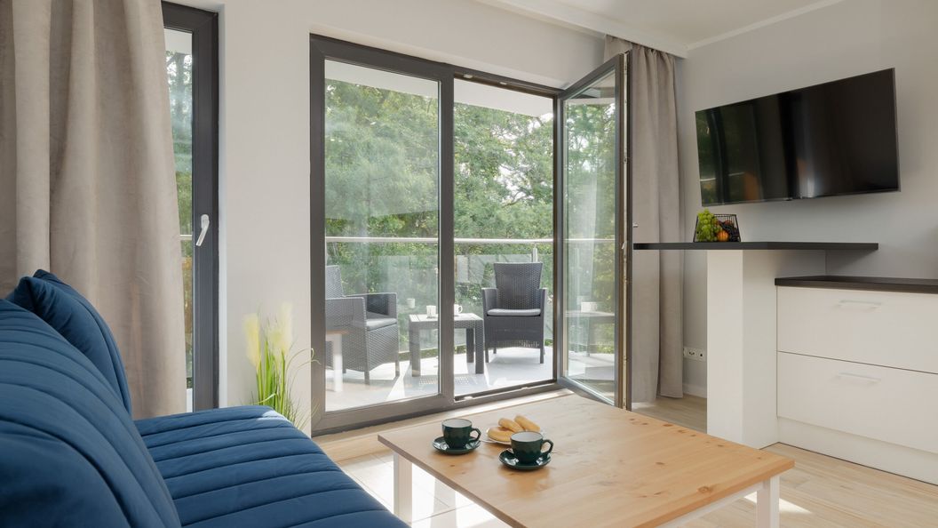 Rozkładana sofa, stolik kawowy, TV, wyjście na balkon