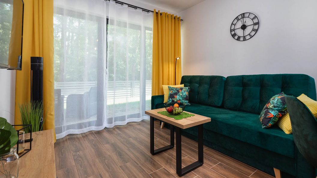 Apartament o powierzchni 33 m² przeznaczony jest dla maksymalnie 4 osób. Składa się z salonu z rozkładaną, 2-osobową sofą i telewizorem oraz oddzielnej sypialni z łóżkiem podwójnym. Do dyspozycji gości jest także w pełni wyposażony aneks kuchenny oraz łazienka z prysznicem. Z obu pokoi można wyjść na prywatny taras z meblami ogrodowymi, który stanowi dodatkową przestrzeń do relaksu.