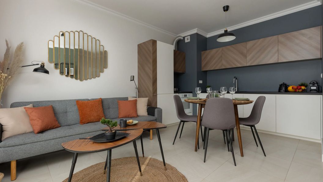 Komfortowy i przestronny apartament, który może pomieścić 3 osoby dorosłe lub 2 osoby dorosłe i 2 dzieci. Składa się z sypialni, salonu z aneksem kuchennym oraz łazienki z prysznicem. Nowoczesna i estetyczna aranżacja lokalu, a także jego kompleksowe wyposażenie - niezbędne sprzęty kuchenne i łazienkowe - zapewniają komfortowy pobyt. Dodatkowo goście mogą skorzystać z telewizora ze Smart TV oraz bezpłatnego Wi-Fi. Dla ułatwienia rozpoczęcia każdego pobytu zapewniono bezpłatny zestaw kosmetyków, ręczniki oraz pościel.