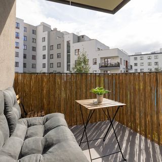 Wygodny apartament znajduje się na nowoczesnym osiedlu, tuż przy biznesowym zagłębiu Mokotowa. Nowe osiedle to wyjątkowa, pełna zieleni inwestycja. Przemyślany projekt architektoniczny składa się z kameralnych budynków położonych w komfortowej odległości od siebie. Centralnym punktem osiedla jest urokliwe jezioro, które wraz z licznymi terenami zielonymi tworzy wyjątkowy ekosystem sprzyjający spędzaniu czasu na świeżym powietrzu. Dla wygody mieszkańców w okolicy znajdują się liczne restauracje, sklepy, siłownia, apteki, piekarnie. Dbając o zwiększenie poczucia bezpieczeństwa osiedle jest strzeżone i posiada recepcję. Lokalizacja zapewnia łatwy dojazd do innych dzielnic, zarówno komunikacją miejską, jak i samochodem. Dużym atutem dla międzynarodowych gości jest bliskość Lotniska Chopina, do którego można dojechać samochodem w 15 minut. Ponadto najbliższe stacje metra (Służewiec i Ursynów) oddalone są o 10 minut jazdy samochodem.
