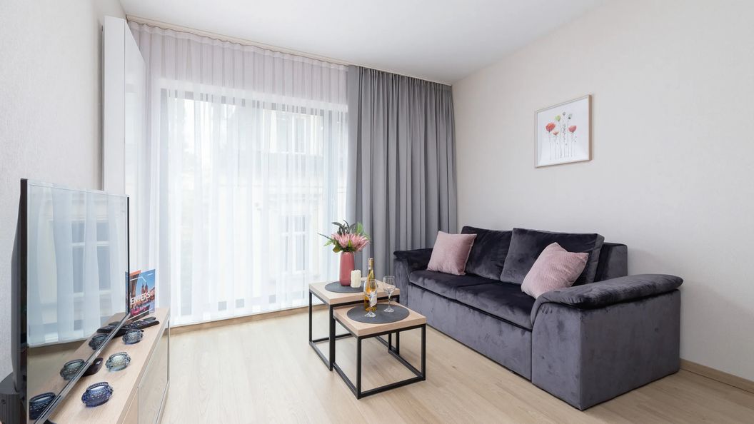 Apartament typu Studio ma możliwość zakwaterowania 2 osób. Składa się z części wypoczynkowej z rozkładaną sofą i telewizorem, w pełni wyposażonego aneksu kuchennego, przedpokoju oraz łazienki z prysznicem i toaletą. Jest to świetne rozwiązanie dla pary lub na wyjazd biznesowy! Goście mogą skorzystać z powitalnego zestawu kosmetyków (mydło, szampon i żel pod prysznic), ręczników oraz artykułów gospodarstwa domowego, takich jak żelazko czy odkurzacz. Apartament posiada również dostęp do szybkiego bezpłatnego Internetu Wifi. W apartamencie znajduje się biurko, które umożliwia bezproblemową pracę zdalną. Nowoczesny design oraz kompleksowe wyposażenie w niezbędne akcesoria kuchenne oraz łazienkowe gwarantują komfort pobytu. W budynku do użytku gości działa pralnia - bezpłatnie. Obiekt nie zapewnia miejsca parkingowego, ale obok znajduje się płatna strefa parkowania, gdzie można zostawić samochód. Przestrzeń mieszkania jest funkcjonalnie zaprojektowana, wychodząc naprzeciw wszelkim potrzebom gości. Zapraszamy również gości podróżujących ze zwierzętami, ponieważ jest to apartament przyjazny pupilom (100 PLN/Pobyt).