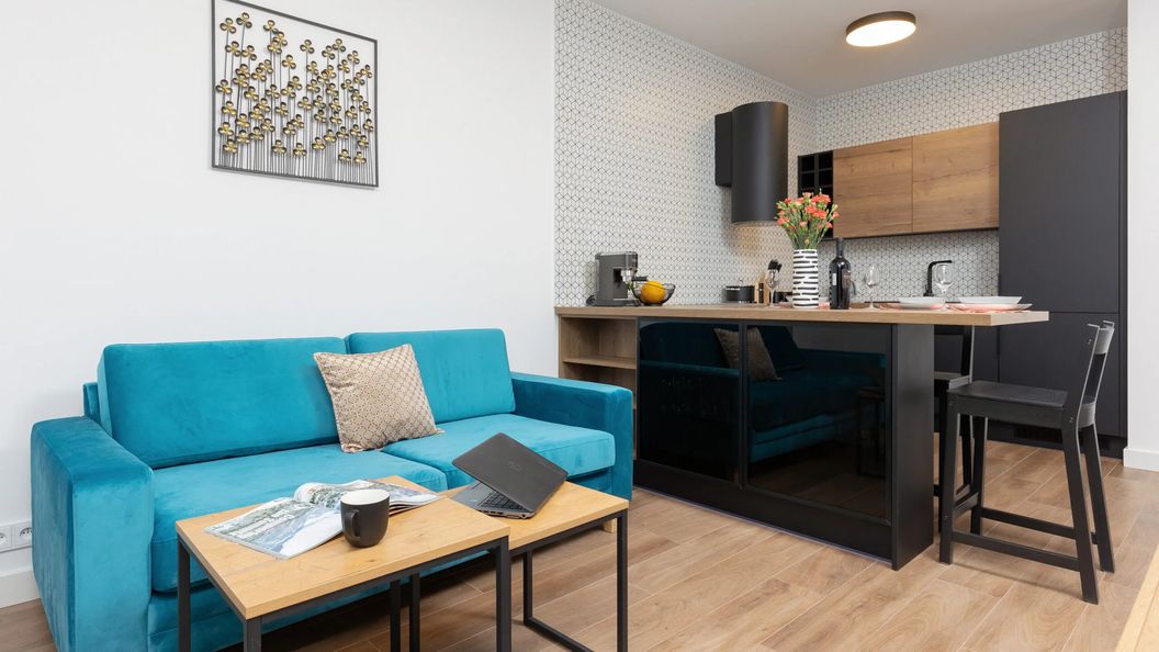 Apartament typu studio jest przystosowany do pobytu maksymalnie 4 osób. Przestrzeń obejmuje salon z rozkładaną, 2-osobową sofą oraz wydzieloną półścianką część sypialną z podwójnym łóżkiem. Do dyspozycji gości jest także prywatny balkon z meblami ogrodowymi, z którego roztacza się widok na wewnętrzny dziedziniec.