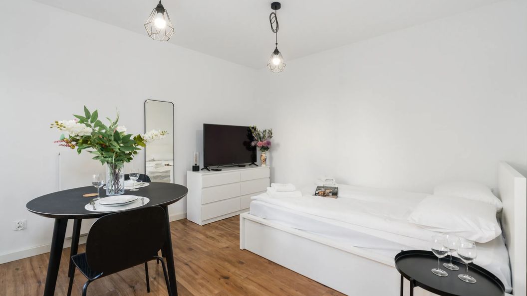 Jasny apartament typu studio - doskonały wybór dla pary lub na wyjazd w pojedynkę. Przestrzeń jest funkcjonalnie podzielona na salon, kuchnię oraz łazienkę z prysznicem. Nowoczesny wystrój i kontrastowa paleta barw nadają wnętrzu poczucie przestronności. Dodatkowo, szeroki wachlarz udogodnień zaspokaja wszystkie potrzeby gości. Do multimediów należy bezpłatny dostęp do sieci Wi-Fi oraz telewizor z płaskim ekranem. Kuchnia i łazienka wyposażone są we wszystkie niezbędne sprzęty, takie jak suszarka do włosów, sprzęt do prasowania, czy zmywarka, które zwiększają niezależność naszych gości. W kuchni znajdują się również wszystkie niezbędne urządzenia do samodzielnego przygotowywania posiłków, takie jak płyta indukcyjna i czajnik elektryczny. Dla ułatwienia rozpoczęcia każdego pobytu zapewniono bezpłatny zestaw kosmetyków, ręczniki i pościel.