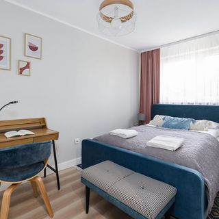 Łóżko podwójne, pościel, pufa, stoliki i lampki nocne, szafy, biurko z krzesłem