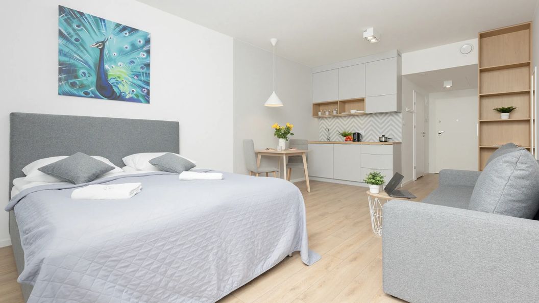 Te stylowe i nowoczesne apartamenty typu studio mogą pomieścić 3 gości. Znajdują się one na 1 piętrze i składają się z salonu z aneksem kuchennym oraz łazienki z prysznicem. W układ sypialny wchodzi wygodna rozkładana sofa oraz łóżko małżeńskie. Gustowny wystrój i przyjemna dla oka paleta kolorów podkreślają przytulną atmosferę apartamentów. W aneksie kuchennym znajdą Państwo niezbędne urządzenia do samodzielnego przygotowywania posiłków, takie jak płyta indukcyjna, czy czajnik. Goście mają dostęp do telewizora Smart TV z telewizją kablową oraz bezpłatnej sieci Wi-Fi, a także do wszystkich niezbędnych urządzeń łazienkowych (suszarka do włosów, sprzęt do prasowania). Miejsce jest doskonałym wyborem dla każdego, kto ceni sobie komfort i funkcjonalność, ale także klimat i estetykę. Dla ułatwienia rozpoczęcia każdego pobytu zapewniony jest bezpłatny zestaw kosmetyków, ręczniki oraz pościel.