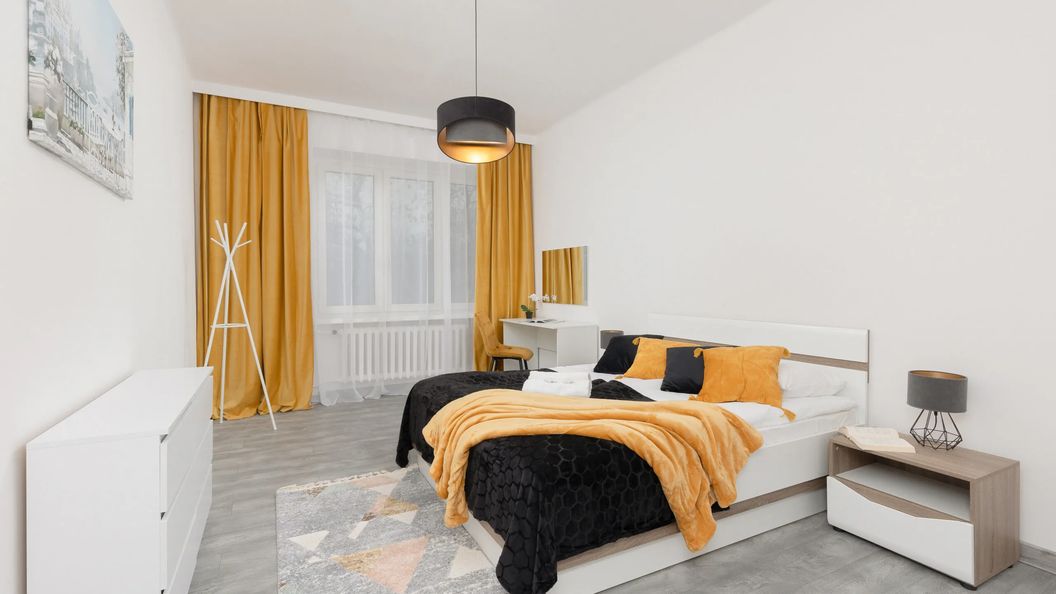 Ten bardzo przestronny apartament o powierzchni 84,93 m² może pomieścić aż do 7 osób. Idealny na wyjazd z przyjaciółmi lub rodziną! Składa się z salonu z rozkładanym narożnikiem, 2 sypialni (jedna z podwójnym łóżkiem, druga z podwójną i pojedynczą rozkładaną sofą), kuchni oraz łazienki z wanną. Mieszkanie jest pięknie urządzone z najwyższą dbałością o szczegóły - tworzy to bardzo przytulną i domową atmosferę. Osoby pracujące zdalnie ucieszy fakt, że obie sypialnie wyposażone są w biurko i krzesło, tworząc wygodną i komfortową przestrzeń. Jest tutaj też balkon, na którym można się zrelaksować z poranną filiżanką kawy czy herbaty na świeżym powietrzu. Apartament wyposażony jest w telewizor SmartTV z płaskim ekranem (+ telewizja kablowa), oraz bezpłatną sieć Wi-Fi. Kuchnia oferuje wszystkie urządzenia do samodzielnego gotowania, takie jak kuchenka elektryczna, piekarnik i czajnik. Dodatkowo w apartamencie znajduje się sejf. Obiekt jest doskonałym wyborem dla każdego, kto ceni sobie komfort i funkcjonalność, ale także estetykę. Aby ułatwić rozpoczęcie każdego pobytu, zapewniono bezpłatne kosmetyki, pościel i ręczniki.