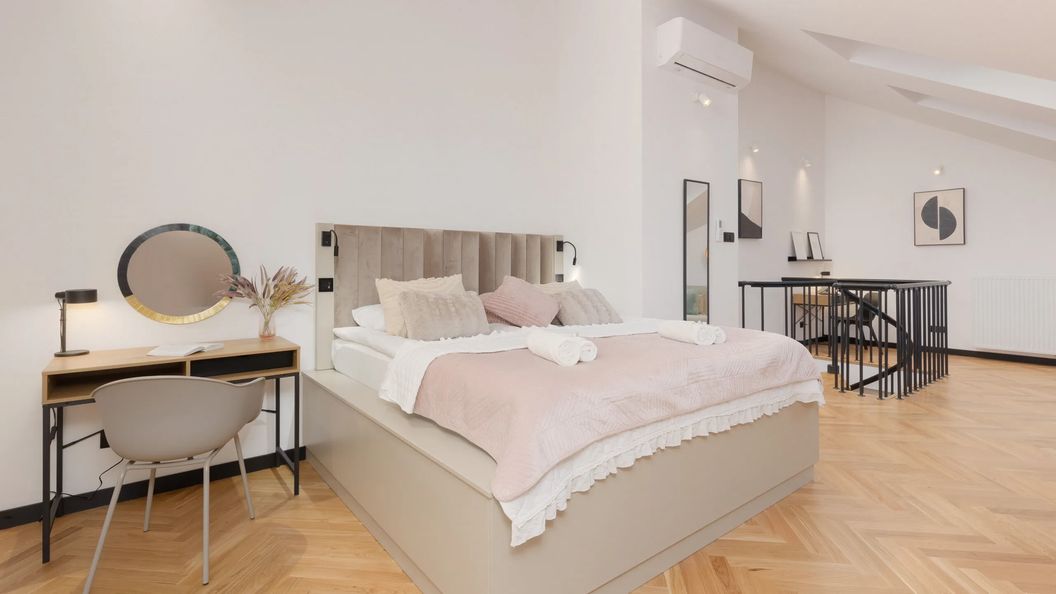 Apartament jest przystosowany do komfortowego pobytu maksymalnie 6 osób. Na jego dwupoziomową przestrzeń składają się dwie sypialnie, salon z aneksem kuchennym oraz dwie łazienki. Miejsca do spania zapewnia sypialnia z łóżkiem podwójnym, druga sypialnia z dwoma łóżkami pojedynczymi oraz rozkładana sofa w części dziennej.