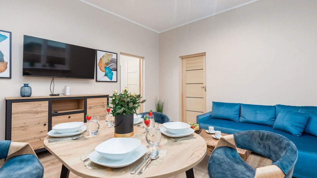 Ten apartament z dwoma sypialniami może pomieścić do 6 gości. Idealny na rodzinne wakacje lub wypad z przyjaciółmi! Przestrzeń podzielona jest na duży salon, w pełni wyposażoną kuchnię, 2 sypialnie (jedna z łóżkiem podwójnym, druga z 2 łóżkami pojedynczymi) oraz łazienkę z prysznicem, do której można wejść z każdej sypialni. Apartament wyróżnia się ekskluzywnym designem i funkcjonalnością. Dobór kolorów wnętrza oraz stylowe dekoracje zapewniają niepowtarzalny klimat. Dodatkowo, standard pobytu podnosi szeroki wachlarz wysokiej jakości udogodnień. Pokój dzienny, wyposażony w rozkładany narożnik i telewizor, to doskonałe miejsce do odpoczynku i relaksu, zwłaszcza po długim dniu spędzonym na plaży. Goście mają dostęp do wszystkich niezbędnych urządzeń łazienkowych, takich jak pralka, suszarka do włosów i sprzęt do prasowania. Kuchnia oferuje wszystkie urządzenia do samodzielnego przygotowywania posiłków, np. piekarnik, kuchenkę gazową i ekspres do kawy. Obiekt jest doskonałym wyborem dla każdego, kto ceni sobie komfort i funkcjonalność, ale także estetykę. Dla ułatwienia rozpoczęcia każdego pobytu zapewniono bezpłatny zestaw kosmetyków, ręczniki i pościel.