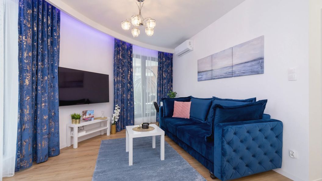Nowoczesny apartament usytuowany na 4. piętrze budynku, o powierzchni 48 m² ma możliwość zakwaterowania 4 osób. Jest to świetny wybór dla pary przyjaciół lub na rodzinny wyjazd! Przestrzeń apartamentu oferuje salon z aneksem kuchennym, osobną sypialnię i łazienkę z wanną z hydromasażem z systemem hydromasażu wodno - powietrznym (możliwość regulacji natężenia siły masażu i napowietrzenia, dostępny program chromoterapii, podwodne ośwetlenie) i toaletą. Przestronna część dzienna z wyjściem na duży, umeblowany balkon (25 m²), wyposażona w wygodną rozkładaną sofę i TV z płaskim ekranem, stanowi świetne miejsce odpoczynku i relaksu. W eleganckiej sypialni znajduje się podwójne łoże małżeńskie. Apartament zapewnia miejsce do pracy zdalnej lub nauki, a także dostęp do szybkiego bezpłatnego Internetu Wifi. Dla jeszcze większego komfortu naszych gości, apartament jest w pełni klimatyzowany. Szeroki wachlarz udogodnień oraz kompleksowe wyposażenie apartamentu w niezbędne akcesoria i sprzęty kuchenne, jak i łazienkowe gwarantuje komfort pobytu. Dla ułatwienia rozpoczęcia każdego pobytu zapewniono bezpłatny zestaw kosmetyków (mydło, szampon i żel pod prysznic), ręczniki oraz pościel. Wnętrze jest jasne i funkcjonalnie zaprojektowane, wychodząc naprzeciw wszelkim potrzebom gości. Nowoczesne wykończenie i piękny design nadają mieszkaniu niezwykły charakter. Do apartamentu przypisane jest miejsce parkingowe w garażu podziemnym.