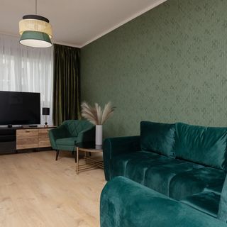 Centralnym punktem apartamentu jest salon, w którym znajdują się dwie rozkładane sofy, fotel oraz telewizor Smart TV z dostępem do kanałów kablowych. Przestrzeń ta została zaprojektowana z myślą o wspólnym spędzaniu czasu i relaksie po dniu pełnym wrażeń.