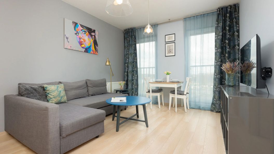 Starannie zaprojektowane wnętrze apartamentu jest odpowiednie na pobyt dla 4 osób. Przestrzeń mieszkania oferuje przestronny salon z aneksem kuchennym, sypialnię z wyjściem na balkon oraz łazienkę z prysznicem i toaletą. Część dzienna wyposażona w wygodną sofę oraz telewizor z płaskim ekranem stanowi doskonałe miejsce odpoczynku i relaksu. Szeroki wachlarz udogodnień oraz kompleksowe wyposażenie apartamentu w niezbędne akcesoria i sprzęty kuchenne, jak i łazienkowe gwarantuje komfort pobytu. Na dobry początek przyjemnego wypoczynku zapewniamy gościom bezpłatne kosmetyki (mydło, szampon i żel pod prysznic), ręczniki oraz pościel. Apartament posiada również dostęp do szybkiego bezpłatnego Internetu Wifi. Kolorystyka mieszkania, wysublimowany i estetyczny wystrój oraz wysokiej jakości wyposażenie podkreślają niezwykły, przytulny klimat apartamentu.