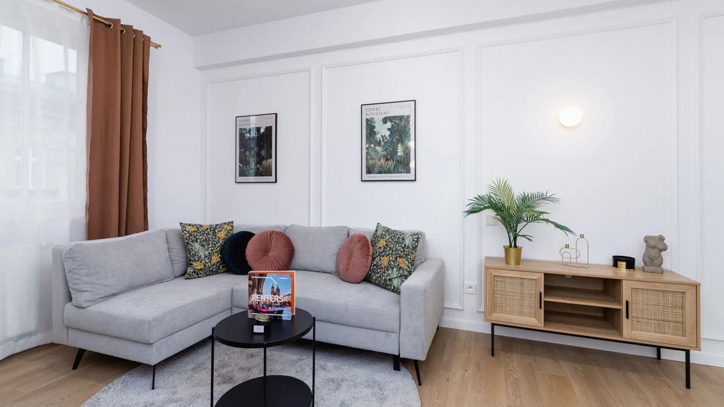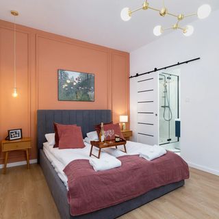 Wysublimowany, indywidualnie zaaranżowany apartament może zakwaterować do 6 osób - idealny na duży wypad z rodziną lub przyjaciółmi. Przestrzeń apartamentu oferuje salon z aneksem kuchennym, dwie sypialnie, dwie łazienki, a także dodatkową toaletę. Nowoczesna i komfortowa aranżacja apartamentu pozwala gościom zanurzyć się w wielkomiejskiej atmosferze nawet we wnętrzu apartamentu. Apartament jest bardzo jasny i stylowy, dodatkowo zapewnia gościom wszelkie wygody dzięki bogatemu wyposażeniu - kompleksowe wyposażenie kuchenne, łazienkowe oraz multimedia (bezpłatne łącze Wi-Fi oraz telewizor z płaskim ekranem z usługą Smart TV). Goście pracujący zdalnie znajdą tu również wygodne miejsce do pracy z laptopem, a dzięki szybkiemu połączeniu internetowemu, nie muszą martwić się o wypełnianie swoich codziennych obowiązków. Wyjątkowe dekoracje dopełniają estetykę wnętrza, nadając mu nowoczesny oraz elegancki charakter. Aby ułatwić rozpoczęcie pobytu, zapewniono bezpłatny zestaw kosmetyków, ręczniki i pościel. Zapraszamy również gości podróżujących ze zwierzętami, ponieważ jest to apartament przyjazny pupilom (Obowiązuje dodatkowa opłata).