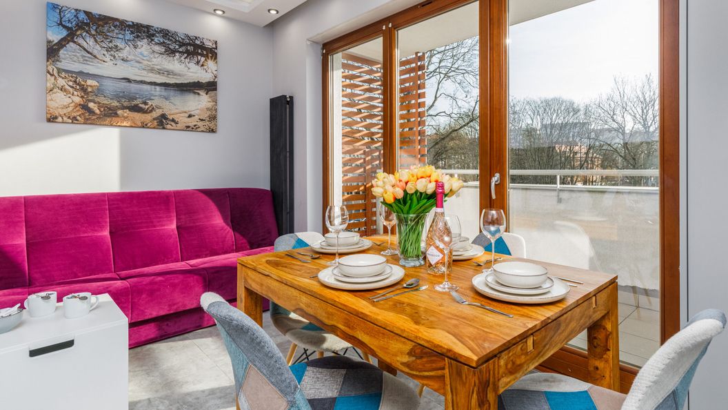 Rozkładana kanapa, komplet pościeli, TV, stolik kawowy, stół jadalniany z krzesłami, szafa, wyjście na balkon