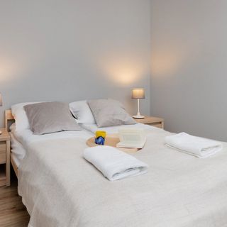 Podwójne łóżko, komplet pościeli, szafki nocne, lampki, biurko z krzesłem, szafa