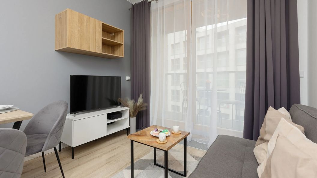 Przestronny apartament usytuowany na Woli znajduje się 4 piętrze i ma możliwość zakwaterowania 3 osób. Składa się on z salonu z aneksem kuchennym, sypialni oraz łazienki z wanną. Przytulna przestrzeń mieszkania oferuje salon wyposażony w wygodną sofę, telewizor oraz wyjście na balkon z meblami wypoczynkowymi. Spokojny widok na wewnętrzny dziedziniec osiedla zachęca do spędzenia wolnych chwil na świeżym powietrzu. Kompleksowe wyposażenie w niezbędne sprzęty domowe takie jak pralka, piekarnik, zmywarka, mikrofalówka, toster czy ekspres do kawy, pozwalają na komfortowy pobyt zarówno na kilka dni jak i tygodni. Łazienka wyposażona jest w wannę i zachęca do relaksacyjnych kąpieli, natomiast dzięki szklanej ściance możliwy jest również szybki prysznic. Sypialnia posiada łóżko małżeńskie oraz dużą szafę co pozwoli poczuć się jak w domu. Na dobry początek każdego pobytu zapewniono bezpłatny zestaw kosmetyków, ręczniki oraz pościel.