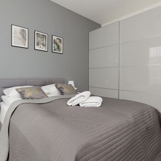 Łóżko podwójne, szafki nocne z lampkami, duża szafa, komoda