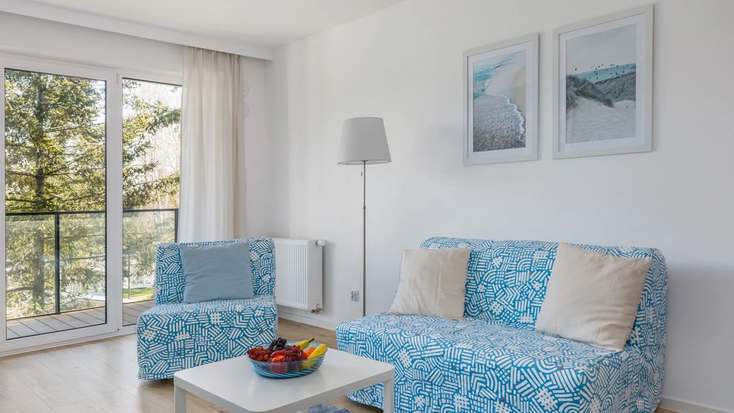 Apartament dla 5 osób to wygodne miejsce do wypoczynku i relaksu. Apartament ten jest idealny dla rodzin z małymi dziećmi, poniważ na wyposażeniu znajduje się łóżeczko dziecięce i krzesełko do karmienia. Sypialnia wyposażona jest w duże, wygodne podwójne łóżko, które zapewni dobrą jakość snu dla dwóch osób. W salonie znajdują się dwie wygodne kanapy, które mogą pomieścić trzy osoby. Wszystkie meble w apartamencie są wygodne i nowoczesne, dzięki czemu goście poczują się jak w domu. Apartament posiada również w pełni wyposażoną kuchnię, która umożliwia przygotowanie posiłków w domu. W kuchni znajdują się wszystkie niezbędne naczynia i przybory kuchenne, a także lodówka, kuchenka, toster i ekspres do kawy. W łazience znajduje się kabina prysznicowa oraz pralka, która jest szczególnie przydatna dla rodzin z dziećmi czy osób planujących długie pobyty. Telewizor wyposażony jest w system Android TV, co - poza telewizją klasyczną i satelitarną - daje dostęp do aplikacji streamingowych (Netflix, HBO Max, Disney+ czy Player). Na ekranie można udostępniać ekran innego urządzenia. Dzięki specjalnej aplikacji i przy pomocy pilota z mikrofonem, telewizorem można sterować za pomocą komend głosowych. Wjazd na teren osiedla możliwy jest wyłącznie dla apartamentów posiadających przypisane miejsce postojowe.