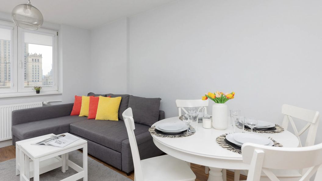 Apartament zlokalizowany przy ulicy Złotej w ścisłym centrum Warszawy, z którego balkonu roztacza się widok na Pałac Kultury i Nauki.