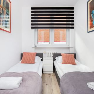 Dwa pojedyncze łóżka, szafa, komplet pościeli