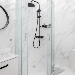 Prysznic, toaleta, umywalka, lustro, ręczniki, suszarka do włosów, zestaw kosmetyków, pralka