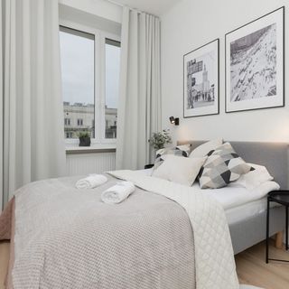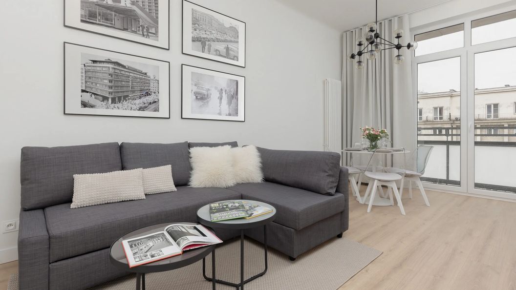 Przestronny apartament dzięki jest w stanie ugościć aż 6 osób, co czyni go idealną propozycją zarówno dla większych rodzin czy też grup znajomych. Składa się z salonu z aneksem kuchenny, balkonu, 2 sypialni oraz łazienki z prysznicem. W każdej z sypialni znajduje się wygodne łóżko, które sprosta oczekiwaniom nawet najbardziej wymagających gości. Kuchnia wyposażona jest we wszystkie niezbędne sprzęty kuchenne, które umożliwiają przyrządzanie smacznych, domowych posiłków. W mieszkaniu goście znajdą udogodnienia, takie jak żelazko, deska do prasowania, pralka czy suszarka do włosów, dzięki czemu apartament będzie świetną opcją zarówno na krótsze wakacyjne wyjazdy jak i długie pobyty. Dużym atutem jest możliwość podziwiania panoramy Warszawy z okien apartamentu. Na dobry początek każdego pobytu zapewniono bezpłatny zestaw kosmetyków, ręczniki oraz pościel.
