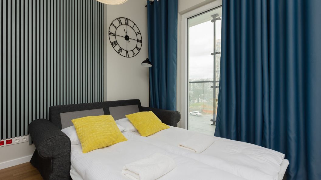 Ten komfortowo wyposażony apartament typu studio może pomieścić 2 gości. Składa się z salonu z aneksem kuchennym, balkonu oraz łazienki z prysznicem. Dużym atutem jest klimatyzacja dbająca o odpowiednią temperaturę wnętrza. Bogate wyposażenie apartamentu takie jak pralka, piekarnik, mikrofalówka czy zmywarka pozwala czuć się jak w domu. Wnętrze jest jasne i gustownie urządzone. Na balkonie znajdują się meble, na których można wypić kawę i oglądać życie Warszawy niezależnie od pogody, dzięki szklanemu zabezpieczeniu. Na dobry początek pobytu zapewniamy gościom bezpłatny zestaw kosmetyków, ręczniki oraz pościel.