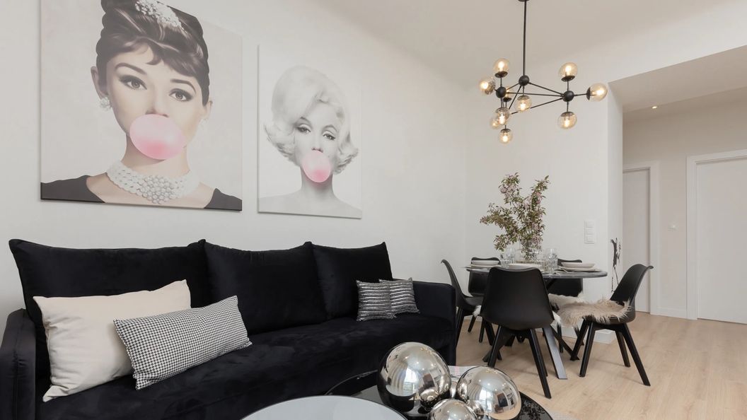 Przestrzeń mieszkalna obejmuje salon z rozkładaną sofą, telewizorem i wyjściem na balkon, a także trzy sypialnie, każda wyposażona w podwójne łóżko. Jedna z sypialni posiada dodatkowy telewizor. Do dyspozycji gości jest łazienka z prysznicem oraz pralką. Wnętrze charakteryzuje się jasnym, nowoczesnym wystrojem.
