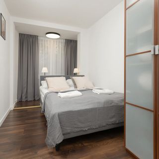 Przytulny apartament zlokalizowany przy ul. Londyńskiej oferuje możliwość noclegu dla 4 osób na powierzchni 36 m². Doskonała propozycja na rodzinny wyjazd do Stolicy. W skład pomieszczeń wchodzi salon z aneksem kuchennym, sypialnia z komfortowym łóżkiem małżeńskim i łazienka z prysznicem. W części dziennej znajduje się rozkładana sofa dla dwóch osób oraz stół z krzesłami, przy którym spożywać można świeżo przygotowane posiłki. Przestrzeń apartamentu urządzona jest z zastosowaniem spokojnej palety barw w odcieniach beżu i szarości, co nadaje całości niezwykle przyjemnego charakteru. Natomiast kuchenna zabudowa oraz drewniana podłoga w odcieniu wenge stanowią idealny kontrast dla jasnych tonów. Elegancki i spójny wystrój w nowoczesnym stylu, funkcjonalny układ pomieszczeń oraz kompleksowe wyposażenie w niezbędne akcesoria kuchenne oraz łazienkowe dają gwarancję najwyższego komfortu pobytu. Goście mogą korzystać z szerokiej gamy udogodnień takich jak telewizor kanałami kablowymi i SmartTV, bezprzewodowe łącze Wi-Fi oraz bezpłatny zestaw kosmetyków, ręczników i pościeli. To miejsce jest przyjazne zwierzętom – pupile są akceptowane za dodatkową opłatą.