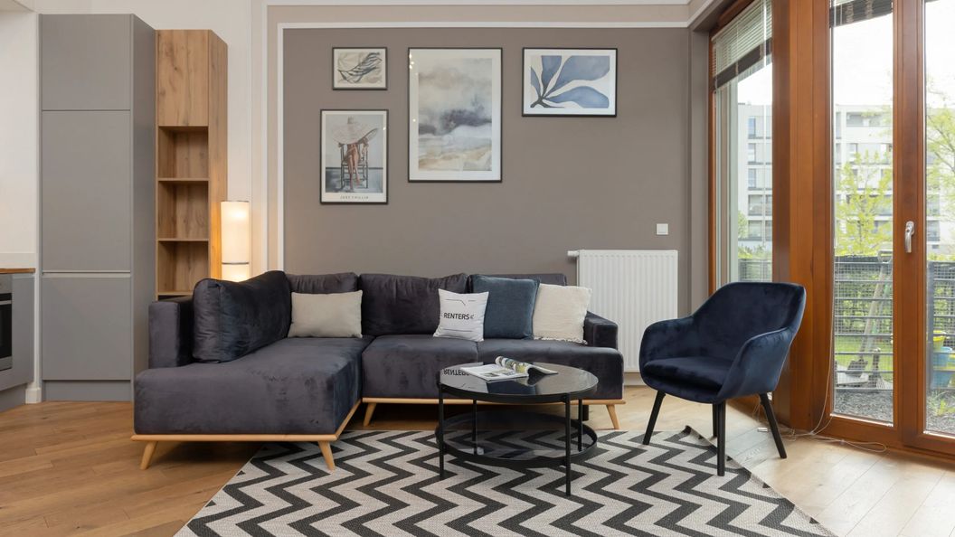 Przestronny apartament przy ul. Bergamotki w Warszawie to wspaniała przestrzeń z możliwością zakwaterowania czterech osób. Niezwykle stylowo urządzone mieszkanie o powierzchni 48,5 m² to doskonały wybór na wyjazd z rodziną lub przyjaciółmi. W skład apartamentu wchodzi piękna sypialnia z wyjściem na taras, duży salon z aneksem kuchennym oraz prywatna łazienka. Harmonijna paleta barw w odcieniach błękitu i szarości oraz estetyczne dodatki cieszą oko na każdym kroku i nadają miejscu wyjątkowego charakteru. Ten apartament to strzał w dziesiątkę dla podróżnych, którzy nie uznają kompromisów w kwestii wygody i stylu. W dodatku, duży dziedziniec z placem zabaw to perfekcyjne rozwiązanie dla rodzin z dziećmi. Apartament zaopatrzony jest we wszystkie podstawy oraz akcesoria kuchenne i łazienkowe niezbędne do wypoczynku. Do dyspozycji gości zapewniono udogodnienia multimedialne – telewizor ze SmartTv oraz szybkie łącze Internetowe Wi-Fi. Na dobry początek każdego pobytu zapewniony został bezpłatny zestaw kosmetyków (mydło, szampon i żel pod prysznic), ręczniki oraz pościel. Mieszkanie posiada przypisane miejsce parkingowe w garażu podziemnym.