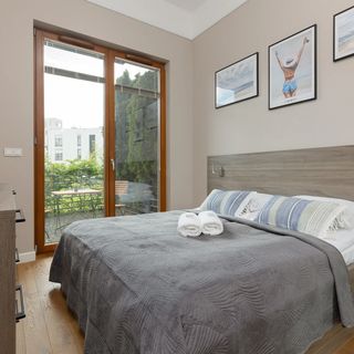 Podwójne łóżko, komplet pościeli, komoda, szafka nocna, szafa, wyjście na balkon