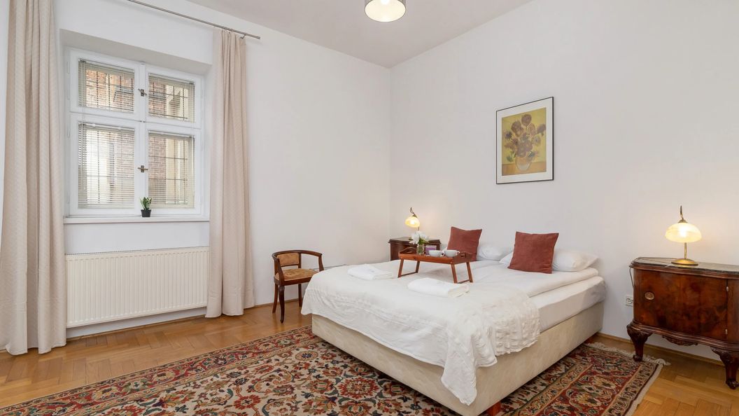 Komfortowy i bardzo przestronny apartament może ugościć 4 gości. Powierzchnia aż 83 m² podzielona jest na salon, niezależną kuchnię, sypialnie oraz łazienkę z wanną. Do dyspozycji gości jest również przytulny balkon znajdujący się przed wejściem do apartamentu — wyposażony w stolik oraz krzesła, gdzie można w spokoju rozpocząć dzień czy też zrelaksować się po długim zwiedzaniu. Przestrzeń apartamentu została zaprojektowana w pięknym, starym stylu a pełne wyposażenie kuchenne i łazienkowe (takie jak pralka, piekarnik czy sprzęt do prasowania) sprawiają, że jest on samowystarczalny. Multimedia w postaci telewizora i bezpłatnego dostępu do sieci Wi-Fi zapewniają rozrywkę. Na dobre rozpoczęcie każdego pobytu, w apartamencie znajduje się bezpłatny zestaw kosmetyków, ręczniki i pościel.