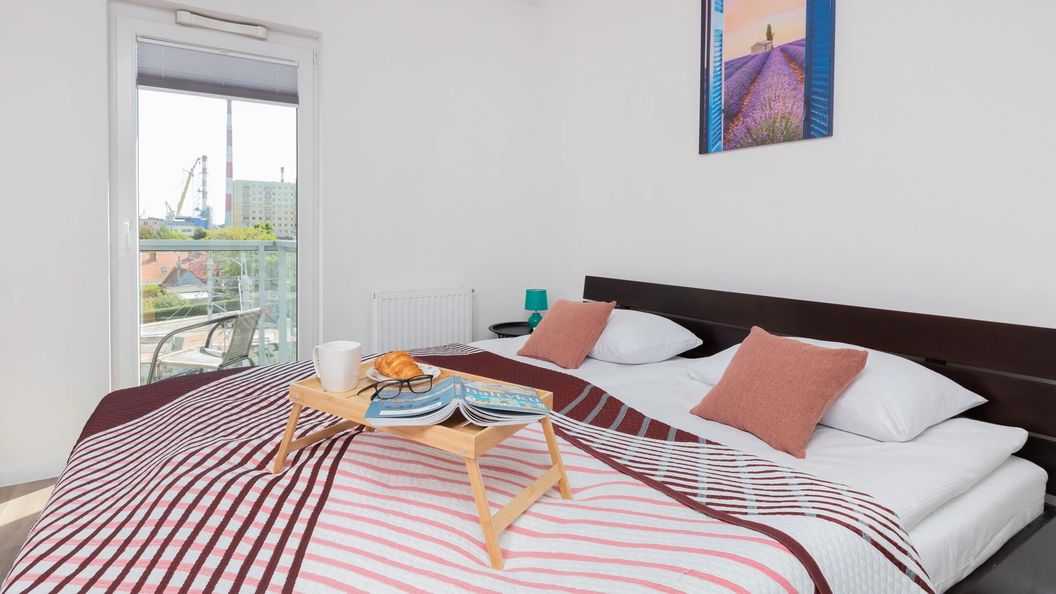 Ten komfortowy apartament może zakwaterować 4 osoby. Składa się z salonu z aneksem kuchennym, sypialni oraz łazienki z prysznicem. Wnętrze zostało wykończone w jasnej, pogodnej palecie kolorystycznej, która tworzy domową atmosferę. Część dzienna wyposażona w wygodną sofę oraz telewizor z dostępem do kanałów telewizji kablowej, stanowi doskonałe miejsce odpoczynku i relaksu. Apartament posiada dostęp do szybkiego bezpłatnego Internetu Wifi. Sypialnia oferuje bardzo wygodne łóżko małżeńskie. Do dyspozycji gości jest przestronny balkon, wyposażony w meble ogrodowe, co umożliwia delektowanie się poranną kawą w towarzystwie pięknego widoku czy odpoczynek na świeżym powietrzu, po dniu pełnym wrażeń. Dodatkowo, aneks kuchenny wyposażony jest w wysokiej jakości sprzęt AGD (mikrofalówka, zmywarka, piekarnik), który pozwoli na przygotowanie ulubionych posiłków. Szeroki wachlarz udogodnień oraz kompleksowe wyposażenie apartamentu w niezbędne akcesoria i sprzęty kuchenne, jak i łazienkowe gwarantuje komfort pobytu. Dla ułatwienia rozpoczęcia każdego pobytu zapewniono bezpłatny zestaw kosmetyków (mydło, szampon i żel pod prysznic), ręczniki oraz pościel. Lokalizacja apartamentu z pewnością pozwoli poczuć klimat miasta wśród najważniejszych atrakcji Gdańska. Do apartamentu przynależy również prywatne miejsce parkingowe w hali garażowej, co jest atutem, szczególnie w sezonie wakacyjnym. Dzięki tym zaletom apartament jest idealnym wyborem na beztroski pobyt w Trójmieście.