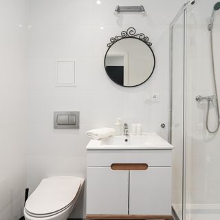 Prysznic, WC, umywalka, lustro, ręczniki, suszarka do włosów, zestaw kosmetyków