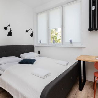 W sypialni przygotowano biurko z krzesłem, co stwarza komfortowe warunki do pracy zdalnej.