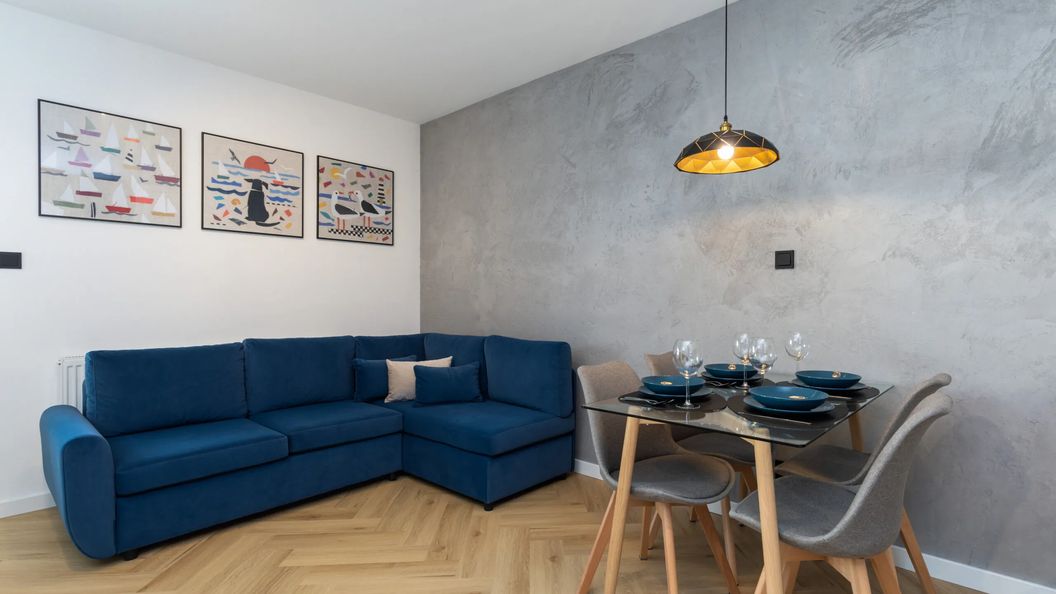 Starannie zaprojektowane wnętrze apartamentu jest odpowiednie na pobyt dla 4 osób. Przestrzeń mieszkania oferuje przestronny salon z aneksem kuchennym, sypialnię, balkon i łazienkę z prysznicem. W pełni wyposażone, gustowne wnętrze wyróżniające się nowoczesnym wystrojem i starannym wykończeniem. Kolorystyka mieszkania oraz wysokiej jakości wyposażenie podkreślają nadmorski klimat apartamentu. Wysublimowany i estetyczny wystrój z wieloma udogodnieniami (zmywarka, ekspres do kawy, toster) zapewnia maksymalny komfort pobytu. Apartament posiada przestronny balkon, wyposażony w meble ogrodowe, co umożliwia delektowanie się poranną kawą w towarzystwie pięknego widoku czy odpoczynek na świeżym powietrzu, po dniu pełnym wrażeń. W sypialni znajduje się biurko idealne do pracy zdalnej czy nauki. Goście mogą również korzystać z szybkiego Wi-Fi i płaskiego telewizora. Aby ułatwić rozpoczęcie pobytu, zapewniono bezpłatny zestaw kosmetyków, ręczniki i pościel. Mieszkanie wyposażone jest w podstawowe udogodnienia, takie jak żelazko, deska do prasowania, odkurzacz i suszarka do włosów. Obiekt wyposażony jest we wszystko, co potrzebne do odpoczynku. Gustowne wnętrze wyróżnia się nowoczesnym wystrojem i starannym wykończeniem. Do apartamentu przynależy również prywatne miejsce parkingowe w hali garażowej, co jest atutem, szczególnie w sezonie wakacyjnym. Pilot otwiera szlaban do parkingu, na którym znajduje się miejsce postojowe przypisane do apartamentu.