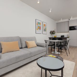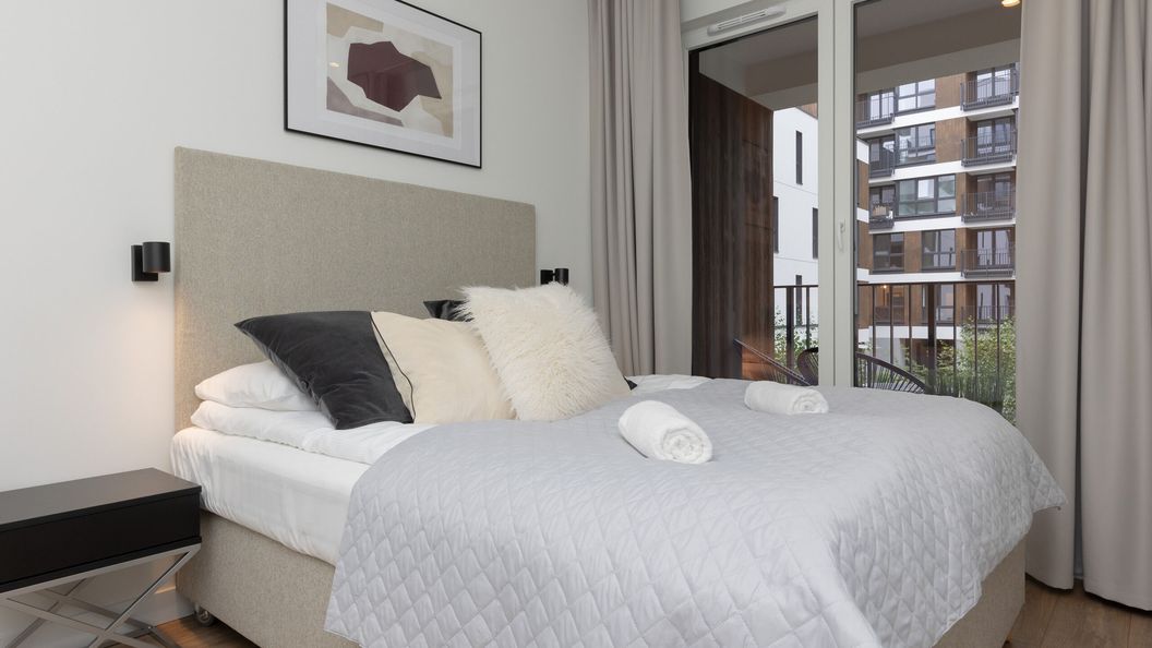 Ta oferta jest idealnym wyborem dla osób, które chcą zanurzyć się w wielkomiejskiej atmosferze stolicy. Nowoczesny i komfortowy apartament z możliwością zakwaterowania 4 osób składa się z salonu z aneksem kuchennym, sypialni z balkonem oraz łazienki z prysznicem. Przestrzeń salonu wypełnia rozkładana sofa, a sypialni — wygodne łóżko. Dużym atutem apartamentu jest balkon, z którego rozpościera się widok na zielony, wewnętrzny dziedziniec. Przemyślany wystrój apartamentu oraz wysokiej jakości wyposażenie gwarantują komfortowy pobyt. Dla gości dostępne są, chociażby: telewizor z płaskim ekranem, sieć WiFi oraz niezbędne akcesoria kuchenne i łazienkowe. Na wyposażeniu mieszkania goście znajdą również pralkę, co z pewnością docenią rodziny z małymi dziećmi czy osoby planujące dłuższy pobyt. Aby ułatwić rozpoczęcie pobytu, zapewniono bezpłatny zestaw kosmetyków, ręczniki i pościel.