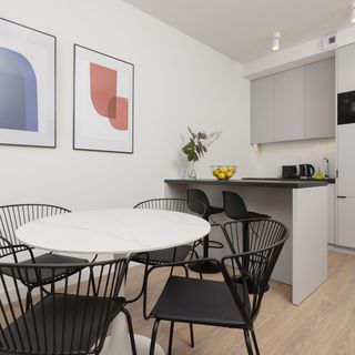 Lodówka z zamrażarką, płyta elektryczna, mikrofalówka, zmywarka, czajnik elektryczny, ekspres do kawy, blat barowy z 6 krzesłami, naczynia, sztućce, garnki i patelnia, kieliszki do wina, pralka
