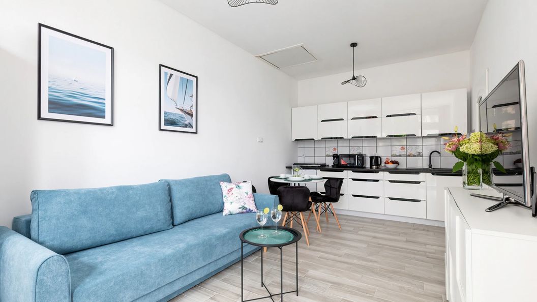 Ten komfortowy apartament z sypialnią o powierzchni 34 m² ma możliwość zakwaterowania 5 osób. Przestrzeń apartamentu oferuje część dzienną z aneksem kuchennym, sypialnię z antresolą oraz łazienkę z prysznicem i toaletą. Salon z rozkładaną sofą i TV, a także sypialnia z wygodnym łóżkiem małżeńskim i miejscem do spania na antresoli, stanowią doskonałe miejsce odpoczynku oraz relaksu. Apartament zapewnia dostęp do szybkiego bezpłatnego Internetu Wifi. Aneks kuchenny wyposażony jest we wszystkie niezbędne urządzenia kuchenne do gotowania i serwowania posiłków. Harmonijny design, szeroki wachlarz udogodnień oraz kompleksowe wyposażenie apartamentu w niezbędne akcesoria i sprzęty kuchenne, jak i łazienkowe gwarantuje komfort pobytu. Dla ułatwienia rozpoczęcia każdej wizyty zapewniono bezpłatny zestaw kosmetyków (mydło, szampon i żel pod prysznic), ręczniki oraz pościel. Dodatkowo, podróżujący z dziećmi rodzice mogą znaleźć na wyposażeniu mieszkania łóżeczko oraz krzesełko dla swojej pociechy. Odpowiedni dobór kolorystyki w połączeniu z jasnym, drewnianym parkietem tworzy domowy i przytulny klimat. Wnętrze jest funkcjonalnie zaprojektowane, wychodząc naprzeciw wszelkim potrzebom gości. Morskie elementy dekoracyjne nadają przestrzeni wyjątkowo spokojny charakter. Zapraszamy również gości podróżującymi ze zwierzętami, gdyż apartament jest przyjazny pupilom.