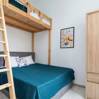 Łóżko podwójne, łóżko jednoosobowe na antresoli, pościel, szafa