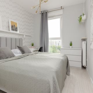 Łóżko małżeńskie, pościel, komoda, szafa z lustrem, biurko z krzesłem