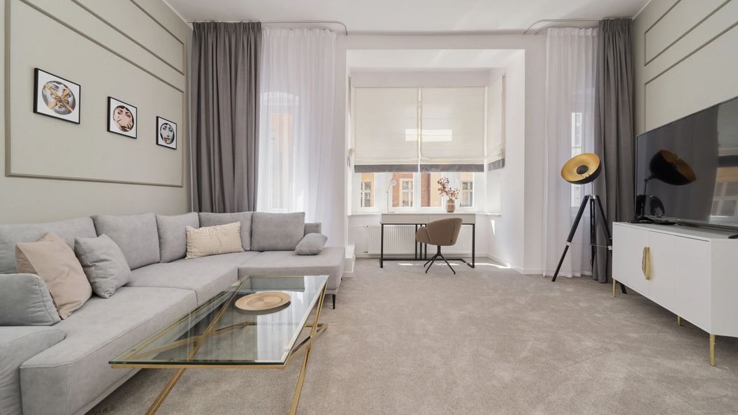 Wnętrze apartamentu odzwierciedla elegancja i architektura odrestaurowanej kamienicy. Wyjątkowa estetyka i klimatyczny wystrój apartamentu z pewnością przypadnie do gustu najbardziej wymagającym. Rozkład pomieszczeń obejmuje salon, kuchnię, sypialnie z podwójnym łóżkiem oraz łazienkę z wanną. Część dzienna wyposażona w 2 rozkładane sofy i TV stanowi doskonałe miejsce odpoczynku i relaksu, a w pełni wyposażona kuchnia umożliwia przyrządzenie ulubionych posiłków. W obu pokojach dostępne są biurka, co w połączeniu z dostępnym Internetem pozwala na komfortową pracę zdalną bądź też naukę. Na wyposażeniu mieszkania goście znajdą również pralkę, co z pewnością docenią rodziny z małymi dziećmi czy osoby planujące dłuższy pobyt. Powitalny zestaw bezpłatnych kosmetyków, ręczników i pościeli zmniejsza stres związany z pakowaniem się przed urlopem.