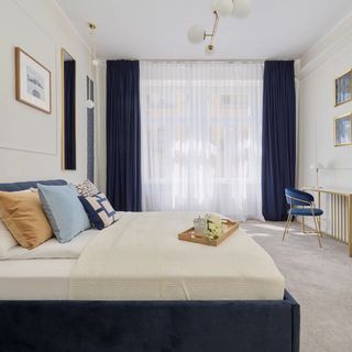 Podwójne łóżko, stoliki nocne, pufa, biurko z krzesłem, szafa
