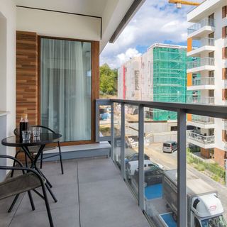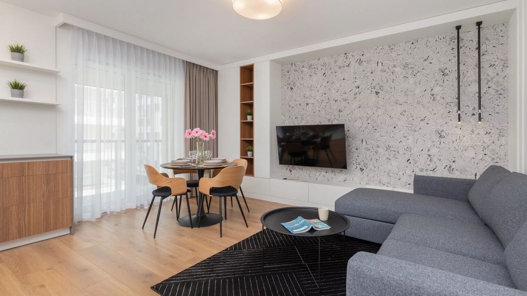 Ten stylowy i klimatyzowany apartament o powierzchni 47 m² oferuje zakwaterowanie dla 4 gości, dzięki czemu jest świetnym wyborem dla pary lub rodziny z dziećmi. Pięknie urządzone mieszkanie składa się z salonu z rozkładaną sofą i aneksem kuchennym, sypialni z łóżkiem małżeńskim oraz łazienki z wanną i toaletą. Z części dziennej można wyjść na balkon wyposażony w meble ogrodowe - jest to idealne miejsce na poranną chwilę relaksu z kubkiem aromatycznej kawy w dłoni. Wygodę w czasie pobytu zapewniają kompleksowe udogodnienia, takie jak bezpłatne łącze Wi-Fi, telewizor z płaskim ekranem oraz niezbędne akcesoria kuchenne i łazienkowe. Na dobry początek wizyty zapewniono gościom bezpłatny zestaw kosmetyków, ręczniki oraz pościel. Modne umeblowanie, eleganckie dodatki oraz funkcjonalna aranżacja mieszkania sprawia, że zaspokoi ono zmysł estetyczny nawet najbardziej wymagających Gości. Spokojna paleta barw, z dodatkiem koloru, nadaje apartamentowi niezwykle przyjemny charakter. W dodatku, obiekt wypełniony jest naturalnym światłem dziennym, dzięki czemu wnętrze jest jasne i przyjemne.