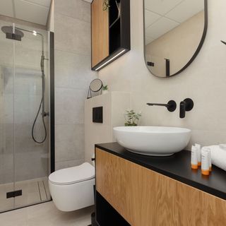 Prysznic, umywalka, szafki, lustro, toaleta